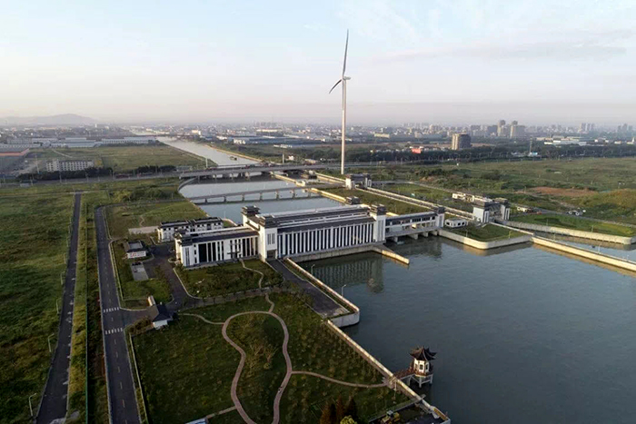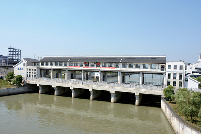 常熟市畅流活水工程-白茆塘枢纽工程是常熟市畅流活水工程的重要组成部分,其主要任务是通过新建口门建筑物,结合其它泵闸建筑物,形成常熟市城区防洪大包围,提高常熟市区东南片区的除涝排水能力,通过防洪大包围工程、配水工程的综合运行调度,形成城区河道活水畅流。工程采用闸站合建的方案,节制闸采用双孔10米钢闸门,净宽20米,泵站采用3台套竖井贯流泵,总规模为45立方米每秒。