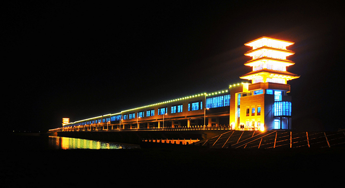 三洋港枢纽工程是新沭河治理工程的主要项目,既是淮河流域防洪保安的重要屏障、沂沭泗流域洪水东调入海的关键性工程,也是江苏沿海开发的重要支撑,被誉为江苏沿海“第一闸”。工程建设内容主要包括:三洋港挡潮闸、排水闸、排水通道土方开挖及护砌、管理处房屋、自动化控制及视频监控系统单位工程。三洋港挡潮闸按新沭河50年一遇洪水标准设计,设计流量6400立方米/秒,挡潮闸共33孔,总宽576.92米,是星空网页版登录入口沿海最大的挡潮闸,其主要功能是:挡潮防淤,保护河道治理成果,保持河道行洪能力;改善排涝条件;利用河槽蓄水,为连云港市增加水源;改善交通条件,促进港口发展。